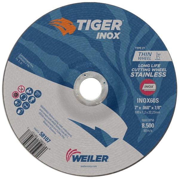 Tiger INOX 7 inch type 27 depressed center cutting wheels are specifically designed for high performance when cutting stainless steel. These wheels incorporate a Contaminant-free bond that delivers a worry-free solution for stainless steel applications. The depressed center provides added clearance when working at a constrained angle and .060" wheel thickness is ideal for cutting tubes, bar stock and large cross-sections with a right angle grinder. The 7/8" open arbor offers a cost-effective mounting option when using adapting nuts. Contaminant-free INOX wheels contain less than 0.1% iron, sulfur, and chlorine, resulting in a worry-free solution for stainless steel applications. Long wheel life on heavy duty applications. Premium aluminum oxide grains provide an even, sharp, clean cut rate and consistent performance. Dual reinforcement provides added strength for aggressive cutting. Smooth outer layer reduces friction that translates to an effortless cut and less kickback during operation.