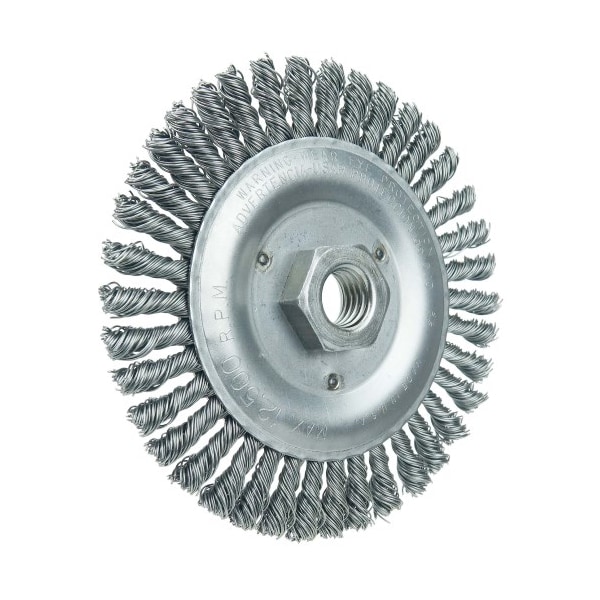 Wolverine 5" Stringer Bead Twist Knot Wire Wheel Brush is suitable for cleaning root and hot passes and reaching into corners. Engineered for cost effective use in less demanding applications. 5/8"11" nut for use on right angle grinders. Narrow face brushes are suitable for cleaning root and hot passes and reaching into corners. Engineered for cost-effective use in less demanding applications. . . .