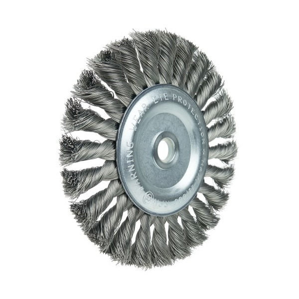 Wolverine 6" Standard Twist Knot Wire Wheel Brush provides an aggressive brushing action for general purpose deburring cleaning and surface preparation applications. Featuring Weiler's individual knot hole construction, these radial brushes are available in heat-treated steel, type 302 stainless steel and bronze wire for use in a wide variety of applications. 5/8"-1/2" arbor hole for use on bench/pedestal grinder and straight grinders. Provide an aggressive brushing action for general purpose deburring cleaning and surface preparation applications. Knot wire wheels with an arbor hole are intended for use on straight grinders and stationary machines such as bench or pedestal grinders and buffing lathes. Featuring Weiler's individual knot hole construction, these radial brushes are available in heat-treated steel, type 302 stainless steel and bronze wire for use in a wide variety of applications. . .
