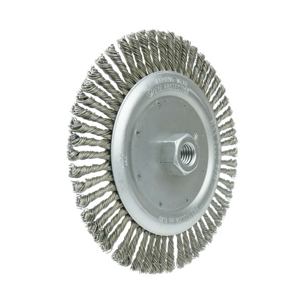 Wolverine 7" Stringer Bead Twist Knot Wire Wheel Brush is suitable for cleaning root and hot passes and reaching into corners. Engineered for cost effective use in less demanding applications. 5/8"11" nut for use on right angle grinders. Narrow face brushes are suitable for cleaning root and hot passes and reaching into corners. Engineered for cost-effective use in less demanding applications. . . .