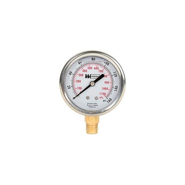 2 1/2" DIAL, LIQUID FILLED, 1/4" NPT BOTTOM, 0-160 PSI WHERE VIBRATION, CORROSION AND PULSATING CONDITIONS EXIST , THE WEISS LINE OF STAINLESS STEEL CASED LIQUID FILLED PRESSURE GAUGES ARE DESIGNED TO MEET THE MOST SEVERE APPLICATIONS. AVAILABLE IN 2 1/2" AND 4"T BRASS CONNECTION. 2 1/2" DIAL ANSI B40.1 GRADE B 4" DIAL ANSI B40.1 GRADE A.