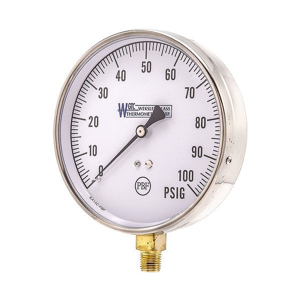 Pressure Gauge, Accuracy +/-1.00 Percent, Process Connection Type NPT, Process Connection Gender Male, Lens Material Plastic, Process Connection Size 1/4 in, Field Fillable No, Process Connection Location Bottom, Case Color Metallic, Dry Dampening Feature Not Applicable, Dial Color White, Pressure Gauge Type Commercial Pressure Gauge, Liquid-Filled Case No, Panel-Mountable No, Socket Material Brass, Sensor Material Bronze; Copper Alloy, Accuracy Grade ASME B40.1, Series EA14