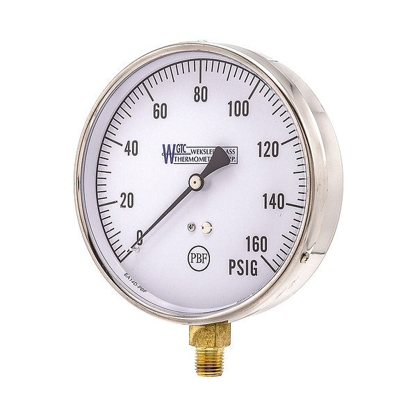 Pressure Gauge, Accuracy +/-1.00 Percent, Process Connection Type NPT, Process Connection Gender Male, Lens Material Plastic, Process Connection Size 1/4 in, Field Fillable No, Process Connection Location Bottom, Case Color Metallic, Dry Dampening Feature Not Applicable, Dial Color White, Pressure Gauge Type Commercial Pressure Gauge, Liquid-Filled Case No, Panel-Mountable No, Socket Material Brass, Sensor Material Bronze; Copper Alloy, Accuracy Grade ASME B40.1, Series EA14