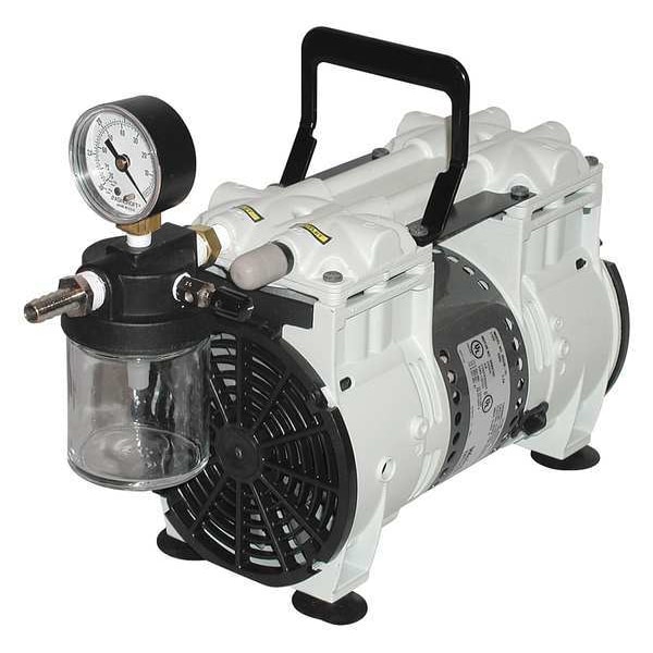 Piston Vacuum Pump, Lubrication Type Oil Free, Number of Cylinders 2, Output Power 0.333 hp, Phase Single, Voltage 115V AC, Maximum Vacuum 29.8 in Hg, Free Air Flow Rate 2.3 cfm, Inlet Size 1/4 in, Inlet Type NPT, Outlet Size 3/16 in, Outlet Type NPT, Outlet Gender Female