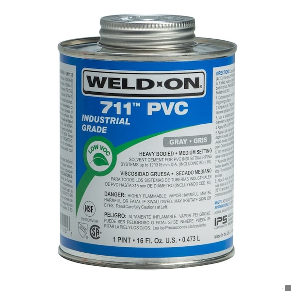 Pipe Cement, For Material Type PVC, Series 711, Container Size 16 fl oz, Container Type Brush-Top Can, For Maximum Pipe Diameter 12 in, Minimum Operating Temperature 32 Degrees F, Maximum Operating Temperature 110 Degrees F, Color Gray, Standards ASTM D2564, NSF, UPC