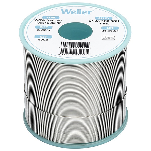 Solder Wire, Form Flux-Cored Wire, Material Composition 96.5 Percent Tin, 3 Percent Silver, 0.5 Percent Copper, Wire Diameter 0.8 mm, Weight 500 g, Melting Temperature (Minimum) 422 Degrees F, Melting Temperature (Maximum) 430 Degrees F, Flux Type No-Clean, Flux Classification ROM1, Solder Series SAC M1, For Joining Metal, Application High Soldering Temperature, Container Type Spool