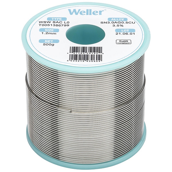 Solder Wire, Form Flux-Cored Wire, Material Composition 96.5 Percent Tin, 3 Percent Silver, 0.5 Percent Copper, Wire Diameter 1.2 mm, Weight 500 g, Melting Temperature (Minimum) 422 Degrees F, Melting Temperature (Maximum) 430 Degrees F, Flux Type No-Clean, Flux Classification ROL0, Solder Series SAC L0, For Joining Metal, Application High Soldering Temperature, Container Type Spool