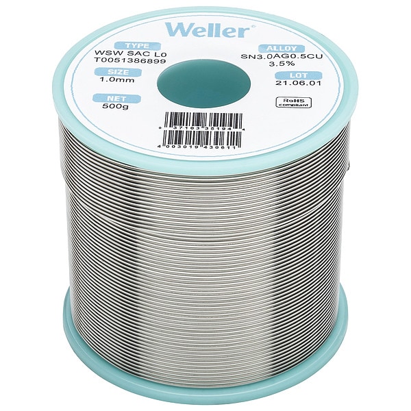 Solder Wire, Form Flux-Cored Wire, Material Composition 96.5 Percent Tin, 3 Percent Silver, 0.5 Percent Copper, Wire Diameter 1 mm, Weight 500 g, Melting Temperature (Minimum) 422 Degrees F, Melting Temperature (Maximum) 430 Degrees F, Flux Type No-Clean, Flux Classification ROL0, Solder Series SAC L0, For Joining Metal, Application High Soldering Temperature, Container Type Spool