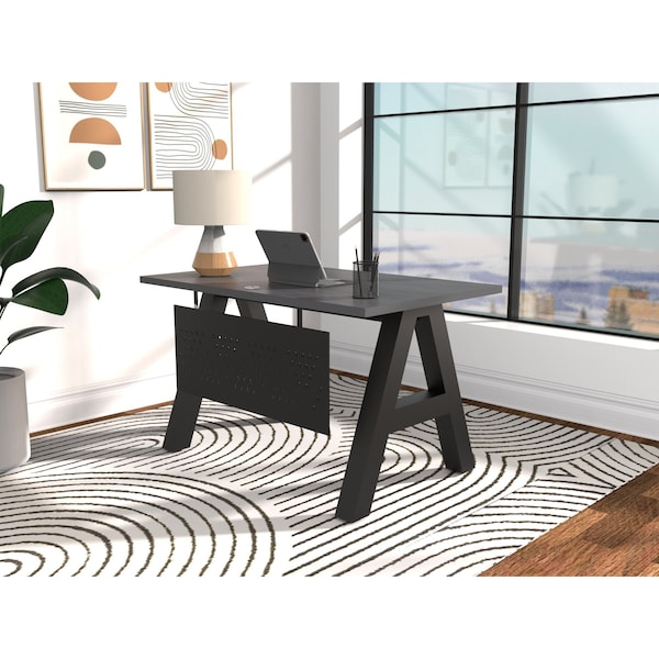 Introducing the A-Frame Writing Desk! This modern and sleek desk is the perfect addition to any office space or study area. With its spacious 48'' x 30'' Charcoal Strand work surface, you'll have plenty of room to work on multiple projects simultaneously. The desk features a built-in modesty panel, providing privacy and adding a touch of elagance and sophistication to the overall design, making it a standout piece in any room. With the A-Frame Writing Desk, you not only get a functional workspace but also a stylish piece of furniture. The combination of the A-Frame design and the durable laminate top creates a modern yet timeless look that will complement any decor. Don't miss out on this opportunity to upgrade your workspace. Experience the convenience, comfort, and style that the A-Frame Writing Desk has to offer. Order yours today and take your work to the next level!