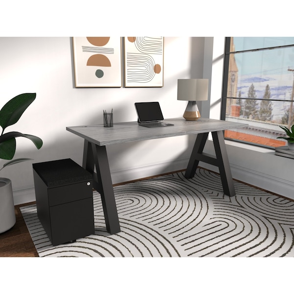 Introducing the A-Frame Writing Desk! This modern and sleek desk is the perfect addition to any office space or study area. With its spacious 60'' x 30'' Grey Oak work surface, you'll have plenty of room to work on multiple projects simultaneously. The desk features a built-in modesty panel, providing privacy and adding a touch of elagance and sophistication to the overall design, making it a standout piece in any room. With the A-Frame Writing Desk, you not only get a functional workspace but also a stylish piece of furniture. The combination of the A-Frame design and the durable laminate top creates a modern yet timeless look that will complement any decor. Don't miss out on this opportunity to upgrade your workspace. Experience the convenience, comfort, and style that the A-Frame Writing Desk has to offer. Order yours today and take your work to the next level!