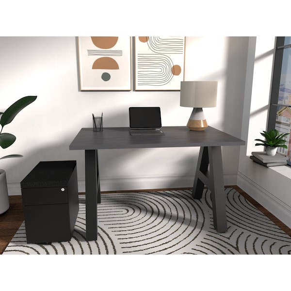 Introducing the A-Frame Writing Desk! This modern and sleek desk is the perfect addition to any office space or study area. With its spacious 48'' x 30'' Charcoal Strand work surface, you'll have plenty of room to work on multiple projects simultaneously. But that's not all - this desk also comes with a mobile storage unit, allowing you to keep your essentials close at hand. Whether it's notebooks, pens, or other office supplies, you can easily store them in the storage unit's lockable drawers. With the A-Frame Writing Desk, you not only get a functional workspace but also a stylish piece of furniture. The combination of the A-Frame design and the durable laminate top creates a modern yet timeless look that will complement any decor. Don't miss out on this opportunity to upgrade your workspace. Experience the convenience, comfort, and style that the A-Frame Writing Desk has to offer. Order yours today and take your work to the next level!