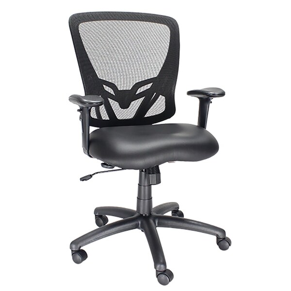 The Mesh it, Zapp Series Black Mesh Back Task Chair with Black Eco Leather Seat is a versatile and stylish seating solution for your office or home workspace. It features a breathable mesh back that provides excellent support and airflow to keep you cool and comfortable throughout the day. The seat is made of eco leather, which offers a plush and supportive seating experience. The chair also comes with built-in lumbar support, adjustable arms, and tilt/tension lock mechanism, allowing you to customize the chair to your preferred sitting position. With its sleek Black frame, this chair adds a touch of modern elegance to any space. Invest in the Mesh it, Zapp Series - Black Mesh Back Task Chair for outstanding comfort and style.