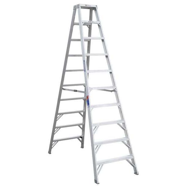 Twin Stepladder, Material Aluminum, ANSI Type IA, Ladder Height 10 ft, Load Capacity 300 lb, Number of Steps 9, Base Spread 78 in, Bottom Width 31 3/4 in, Step Depth 3 in, Step Tread Ribbed, Series T370, Standards ANSI A14.2-2007, OSHA Compliant, Rung/Step Spacing 12 in