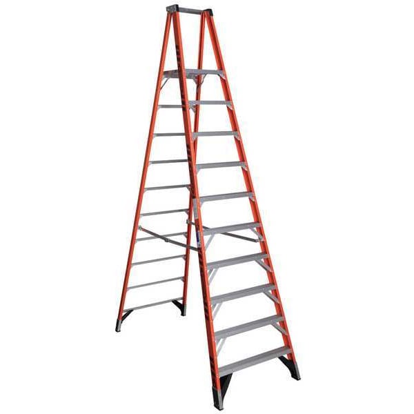 Platform Stepladder, Material Fiberglass, ANSI Type IA, Ladder Height 12 ft, Load Capacity 300 lb, Number of Steps 10, Base Spread 79 in, Bottom Width 37 1/2 in, Step Depth 3 in, Step Tread Ribbed, Series P7400, Includes Slip Resistant Traction Tred Steps, Reinforced Top Connectors and A Safety Guard Rail, EDGE Bracing, Standards ANSI A14.5-2007, OSHA Compliant, Rung/Step Spacing 12 in
