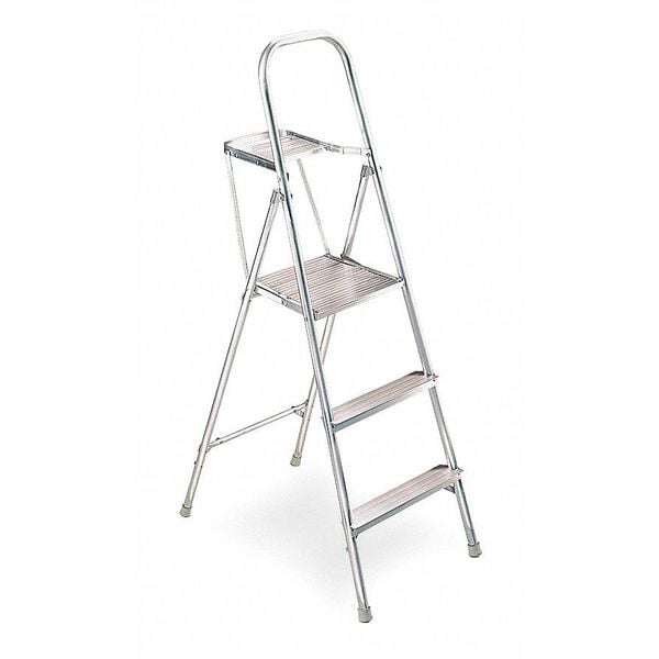 Platform Stepladder, Material Aluminum, ANSI Type III, Ladder Height 5 ft 6 in, Load Capacity 200 lb, Number of Steps 3, Base Spread 21 1/2 in, Bottom Width 33 1/4 in, Step Depth 3 in, Step Tread Ribbed, Series 260, Includes Mar-resistant Feet, Pail Holder with Rag Rail and Tool Holders, Standards ANSI, Rung/Step Spacing 12 in