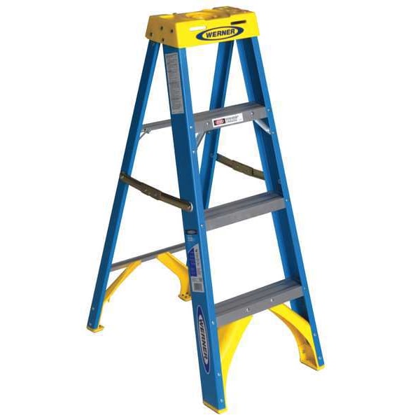 Stepladder, Material Fiberglass, ANSI Type I, Ladder Height 4 ft, Load Capacity 250 lb, Number of Steps 3, Base Spread 28.9 in, Bottom Width 19 in, Step Depth 3 in, Step Tread Ribbed, Series 6000, Includes Drill Holster for Added Convenience, Standards ANSI A14.5-2007, OSHA Compliant, Rung/Step Spacing 12 in