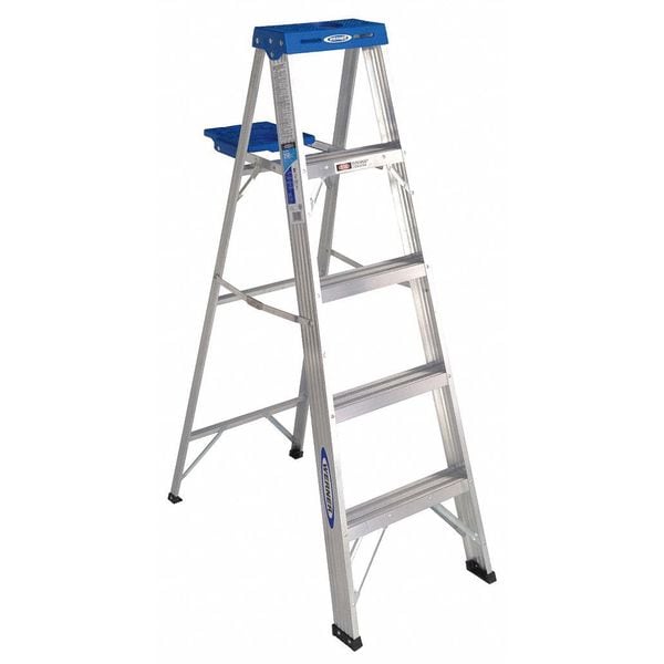 Stepladder, Material Aluminum, ANSI Type I, Ladder Height 5 ft, Load Capacity 250 lb, Number of Steps 4, Base Spread 35.5 in, Bottom Width 20 in, Step Depth 3 in, Step Tread Ribbed, Series 360, Includes Pail Shelf, Standards ANSI A14.2-2007, OSHA Compliant, Rung/Step Spacing 12 in