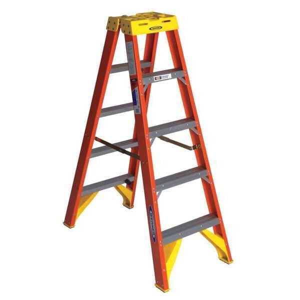 Twin Stepladder, Material Fiberglass, ANSI Type IA, Ladder Height 5 ft, Load Capacity 300 lb, Number of Steps 4, Base Spread 43.1 in, Bottom Width 21 5/8 in, Step Depth 3 in, Step Tread Ribbed, Series T6200, Includes Drill Holster for Added Convenience, Standards ANSI A14.5-2007, OSHA Compliant, Rung/Step Spacing 12 in