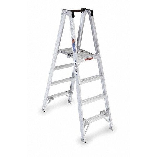 Twin Platform Stepladder, Material Aluminum, ANSI Type IA, Ladder Height 6 ft, Load Capacity 300 lb, Number of Steps 4, Base Spread 50.5 in, Bottom Width 24 3/4 in, Step Depth 3 in, Step Tread Ribbed, Series PT370, Includes A Safety Guard Rail, Pinch Proof Platform, Slip Resistant Foot Pads, Slip Resistant Traction Tred Steps, Standards ANSI A14.2-2007, OSHA Compliant, Rung/Step Spacing 12 in