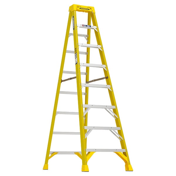 Stepladder, Material Fiberglass, ANSI Type IAA, Ladder Height 8 ft, Load Capacity 375 lb, Number of Steps 7, Base Spread 53.6 in, Bottom Width 27 in, Step Depth 3 in, Step Tread Ribbed, Series 6300, Includes Top with Drill Holster and Slots for Lock-In Accessories, Standards ANSI A14.5-2007, OSHA Compliant, Rung/Step Spacing 12 in