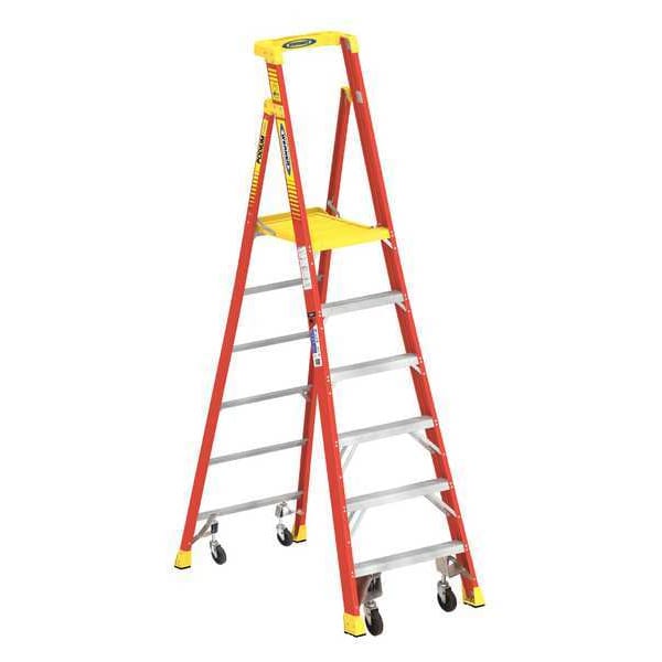 Podium Stepladder, Material Fiberglass, ANSI Type IA, Ladder Height 9 ft, Load Capacity 300 lb, Number of Steps 6, Base Spread 56 in, Bottom Width 31 in, Step Depth 3 in, Step Tread Ribbed, Series PD6200-4C, Includes Factory Installed Spring Activated Casters, Large Standing Platform with Toe Guard, Waist High Guard Rail with Slots for Accessories, Standards ANSI A14.5-2007, OSHA Compliant, Rung/Step Spacing 12 in
