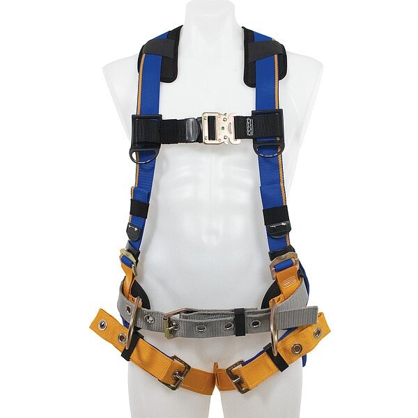 Harness, Harness Style Vest, Specialty Working Conditions Not Applicable, Safety Features Belt, Trauma Strap, Chest Strap Buckles Quick-Connect, Harness Color Black/Blue/Yellow, Harness D-Ring Material Steel, Harness Sizing S, Includes Padding Yes, Leg Strap Buckles Tongue, Padding Location Back, Shoulder, Waist, Torso Adjustment Mating, Weight Capacity 425 lb, Harness Application General Use, Positioning, D-Ring Locations Back, Hips, RFID Equipped No, Industry Construction, General Industry