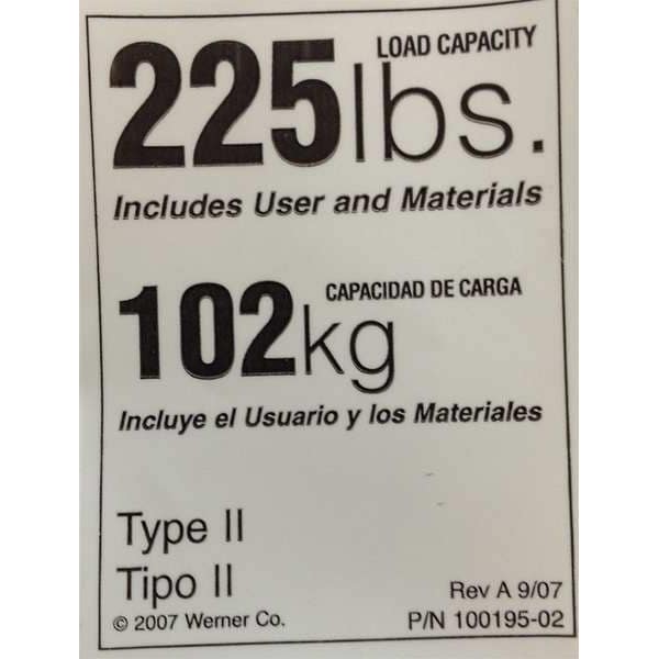 Duty Rating Label Replacement, 225 lb., For Use With Grainger Item Number 41D331,41D329,4GNL1,41D332,41D330, For Use With Mfr. Model Number D1216-2,D1216-3,D1220-2,D1224-2,D1224-3,D1228-2, Fits Brand Werner