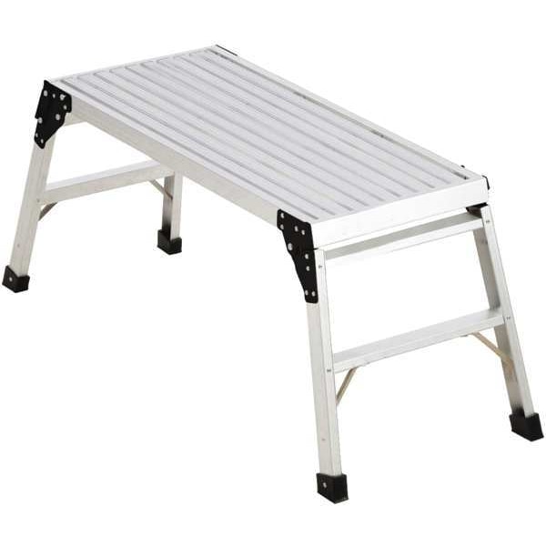 Number of Steps 1, Overall Height 20.5 in, Material Aluminum, Load Capacity 300 lb, Bottom Width 19 5/8 in, Base Depth 58 3/4 in, Color Silver, Finish Aluminum, Includes Folding Legs and Rubber Foot Pads, Standards OSHA and ANSI, Step Tread Serrated, Step Width 16 in