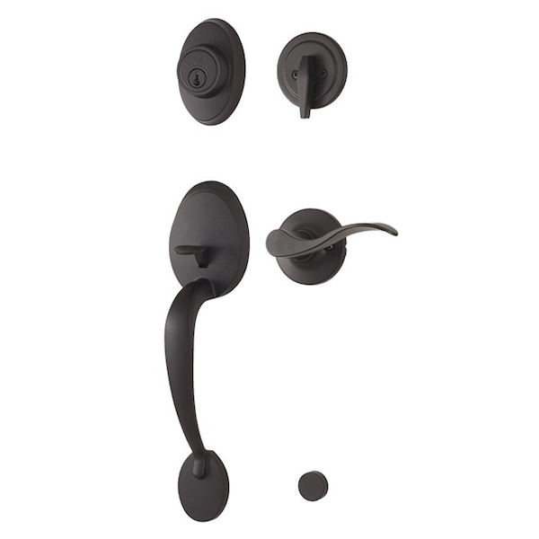 Premiere Essentials Hillcrest entry handle with a single cylinder deadbolt that comes with adjustable spring latch & adjustable dead bolt latch, round faceplate & round strike, round foot cap screw, and assembly screws with wood screws. Interior Round Single Cylinder Deadbolt rosette with Passage rosette with spindle attached to mounting plate, and a left handed New Haven lever. Easy to follow instructions. Hillcrest Single Cylinder Handleset with Left Hand New Haven Trim with Adjustable Latch and Round Corner Strikes Matte Black Finish.