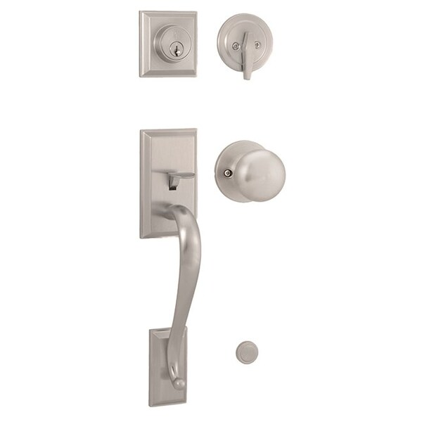 Premiere Essentials Hillcrest entry handle with a single cylinder deadbolt that comes with adjustable spring latch & adjustable dead bolt latch, round faceplate & round strike, round foot cap screw, and assembly screws with wood screws. Interior Round Single Cylinder Deadbolt rosette with Passage rosette with spindle attached to mounting plate, and a non-handed Somerset lever. Easy to follow instructions.