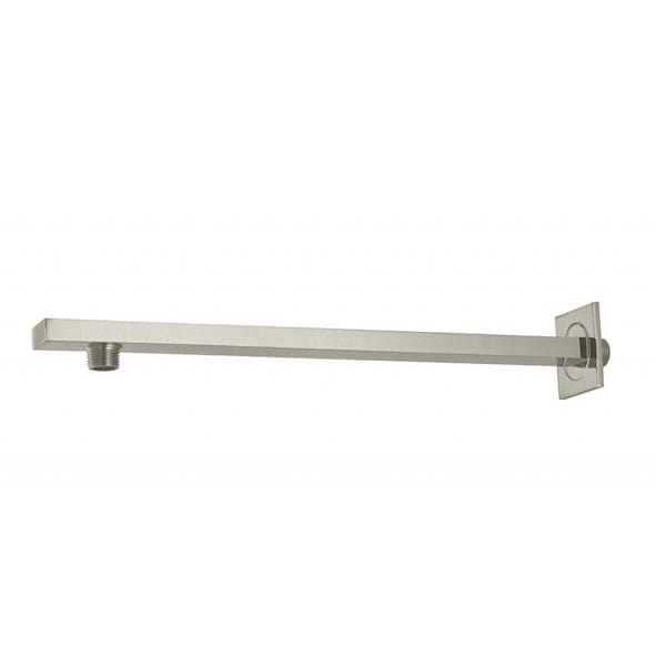 This modern square 1/2 in. IPS, 16 in. long rain shower arm with contemporary square flange, directs the spray pattern of medium to large diameter deluge heads at the perfect angle for that rain shower feel while maintaining its contemporary appearance. Wall mounted 90-degree rain shower arm with square decorative flange. 1/2 in. male IPS inlet and outlet. 16 in. to outlet. 17-1/2 in. overall length. Lead-free brass.