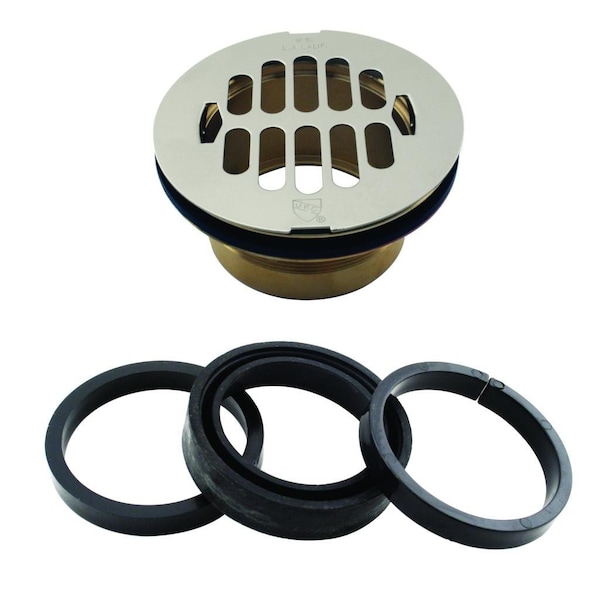 This Brass shower drain body, mounts to fiberglass, acrylic and solid surface shower pans and stalls. The drain plumbs with 2 in. sch. 40 pipe, secured by a rubber compression swedgelock gasket driven in place by the installer. This drain uses the D3198 replacement grate. Brass body shower drain, with a brass or stainless steel grate. Fits 2" ABS or PVC pipe. Uses driven no-caulk rubber swedgee. Drain rim is fully covered by the grate.