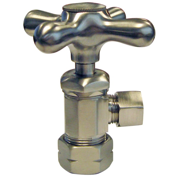 This Angle Stop with Cross Handle is the perfect compliment for sinks and toilets. It uses a 5/8 in. Compression Inlet (For 1/2 in. Copper pipe) with a 3/8 in. OD Compression outlet with nut and ferrule. The valve uses a compression style closure for a positive seal. It is available in a variety of finishes.