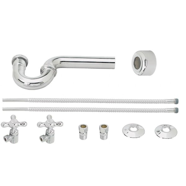 This Westbrass Pedestal Lavatory Kit with universal 3/8 in. angle stops with cross handles, 3/8 in. x 20 in. corrugated annealed brass risers, and 1-1/2 in. x 1-1/2 or 1-1/4 in. P-Trap with high box flange, is perfect for dressing up an exposed or console style Kitchen or Bathroom sink. The angle stops fit both 1/2 in. IPS or 1/2 in. Copper Pipe (5/8 in. Nominal) and come with sure grip flanges to fit both sizes. Changing washers allows the P-Trap to fit both Kitchen and Bath sinks, and is the perfect finished compliment for any 1-1/2 in. IPS sink rough-in.