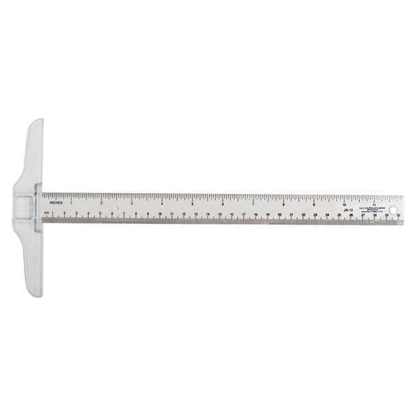 T-Square, Base Length 6 in, Base Width 1 in, Blade Length 12 in, Blade Width 1 in, Blade Material Plastic, Graduation Mark Style Printed, Graduation Marks - Base 1 cm, 1/16 in, Graduation Marks - Blade 1 cm, 1/16 in, Specialized Scales Not Applicable, Base Material Plastic, System of Measurement SAE, Square Type T-Square, Coating Not Applicable, Edge Style Square, Finish Matte, Graduation Color Black, Straightness Tolerance Not Applicable, Thickness 0.2 in, Numeric Marks Centimeters, Inches