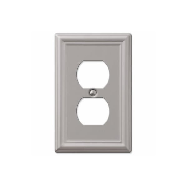 1 Duplex wall plate. Chelsea brushed nickel finish. Made from stamped steel. This stylish wall plate adds simple elegance to your decor. Manufactured by the leader in decorative wall plates and hardware.