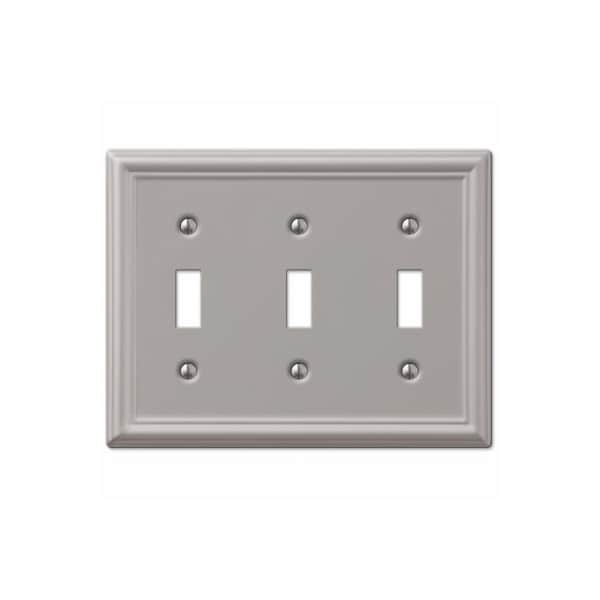 3 Toggle wall plate. Chelsea brushed nickel finish. Made from stamped steel. This stylish wall plate adds simple elegance to your decor. Manufactured by the leader in decorative wall plates and hardware.