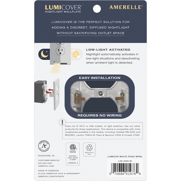 Duplex nightlight wall plate. Converts any outlet into a nightlight. Features an LED (light emitting diode) strip along the bottom of the wall plate that projects light downwards to illuminate a path. Automatic dusk to dawn control saves energy and automatically increases light intensity when motion is detected. Higher brightness lasts 60 seconds and then returns to original level of light. Color changing feature allows user to select any color of the rainbow. Universal fit on all standard outlets. Ideal for hallways bedrooms or any area visited at night. Unique low-profile design keeps both outlets available for other items that need power. Patented design uses tiny copper fins mounted on the back to slide into and connect to outlet to power LEDs with no wiring necessary.