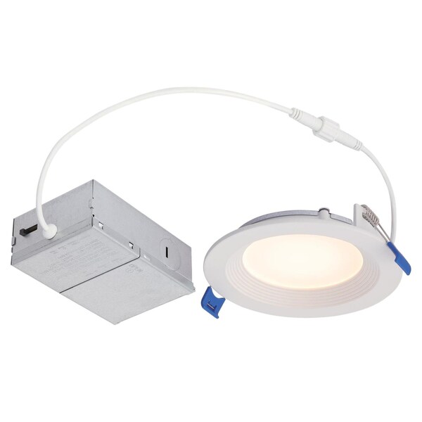 The Westinghouse Dimmable 10-Watt 4-Inch Stepped Baffle Slim Recessed LED Downlight saves energy and replaces traditional recessed can light, trim, and bulb, providing a sleek and modern look.With the color temperature selection feature, you can easily choose between five options ranging from warm white to daylight 2700K, 3000K, 3500K, 4000K, or 5000K, ensuring the perfect light appearance for any application.This downlight is designed for convenience and has a slim profile of just 1/2, making it ideal for shallow ceilings and recessed spaces in new and remodel applications. Installation is a breeze with its 13-inch feed wire between the light and external driver, twist-lock connector, and powerful spring clips. Meets the high efficacy requirements stated in California's 2022 Title 24, Part 6 regulations. Product reference number 52261.