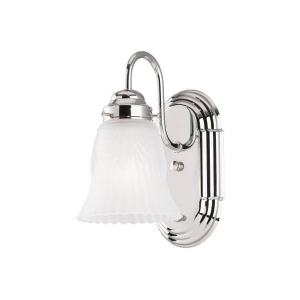 1 Light, Wall Mount, Light Fixture, With OnOff Switch, Chrome Finish With Frosted Pleated Glass, Height 9, Width 512, Extends 758, Use 1 Standard Base, Soft White, A19, 100W Maximum Or Torpedo 60W Maximum