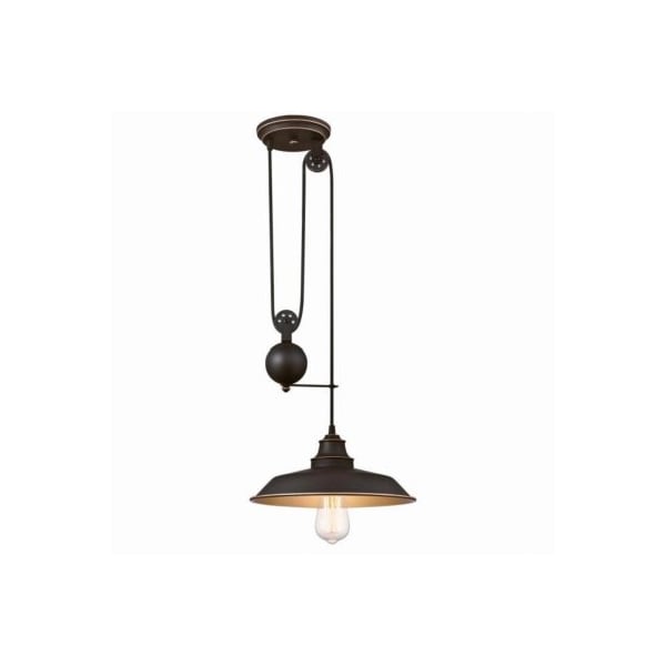 1 light, Oil Rubbed Bronze finish with highlights, Iron Hill pulley pendant 25916 H x 12 Diameter, for indoor use, uses one 60watt mediumbase light bulb not included, recommended use home, office reception area, upscale restaurant or boutique