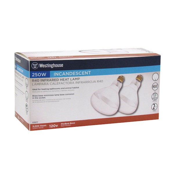 Incandescent infrared heat reflector light bulbs are available in a standard R40 shape. These light bulbs last on average up to 5000 hours. To help you find the right bulb for the right application, see Westinghouse full offering of infrared heat light bulbs available in multiple wattages as well as clear and red finishes. These reflectors with medium screw bases are perfect for use in brooder lamps. They are also compatible for use with standard household fixtures including bathroom heat lamps. Product reference number 03977.