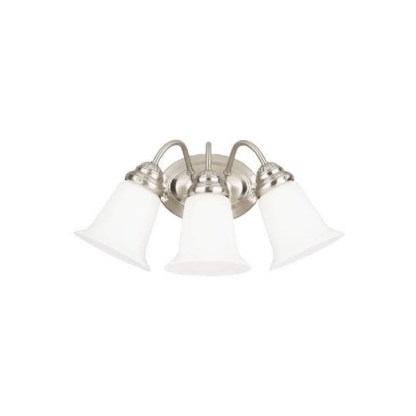 3 Light Wall Bracket, Brushed Nickel Finish, Opal Glass Shades, Length 1714, Height 778, Extends 814, Uses 3 Clear Standard Base Bulbs, A19, 60W Maximum