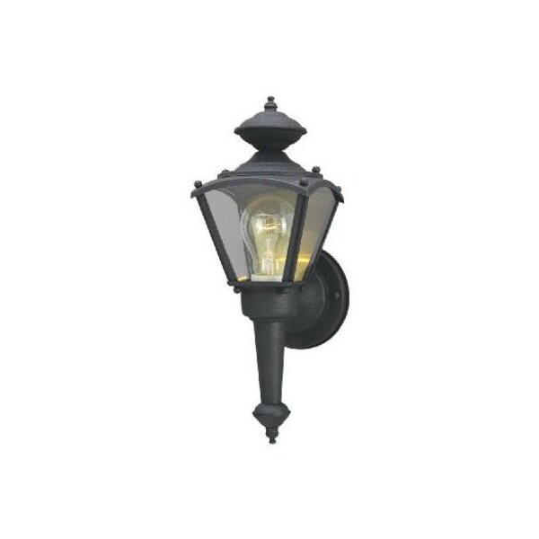 Single Light Coach Lantern, Black Textured Finish, Clear Glass Panels, Width 434, Height 1312, Extends 512, Uses Clear Standard Base Bulb, A19, 100W Maximum