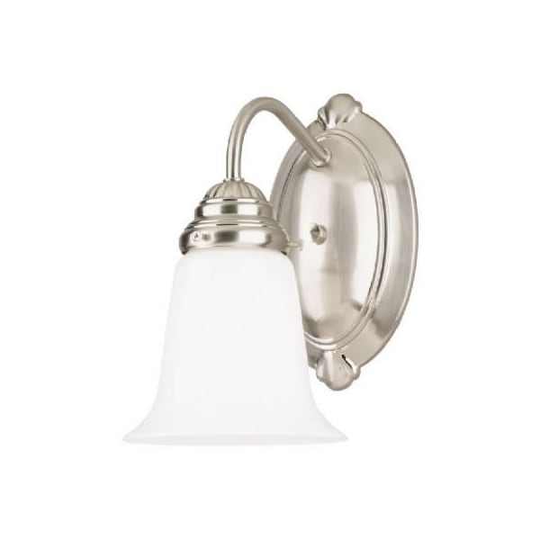 Single Light Wall Bracket, Brushed Nickel Finish, Opal Glass Shade, Width 478, Height 834, Extends 758, Uses Clear Standard Base Bulb, A19, 60W Maximum