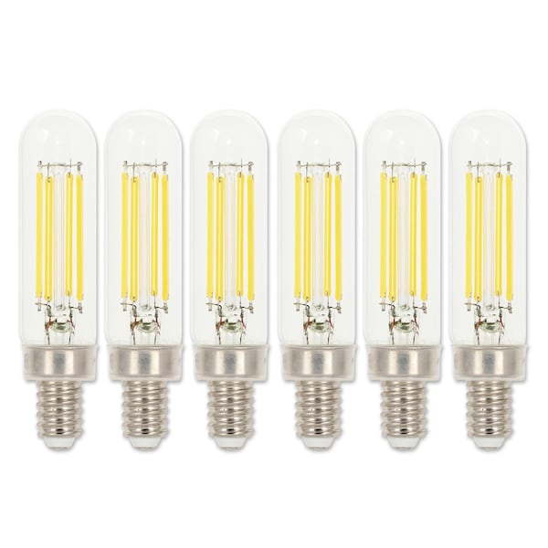 - Bulb Description: 6-Pack, dimmable, decorative T6 LED bulb, E12 candelabra base, clear finish, approved for wet locations and enclosed fixtures