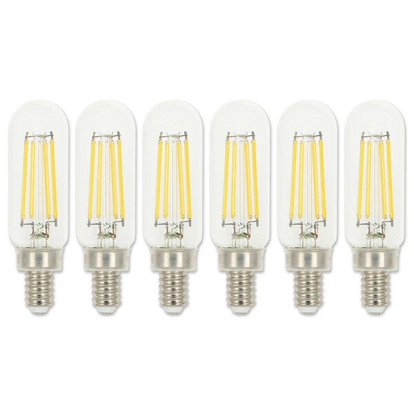 - Bulb Description: 6-Pack, dimmable, decorative T8 LED bulb, E12 candelabra base, clear finish, approved for wet locations and enclosed fixtures