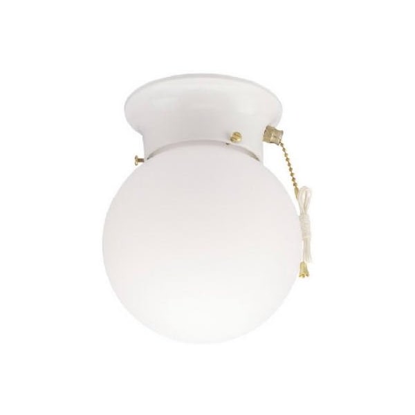 Single Light Flush Mount Ceiling Fixture, White Finish, Pull Chain, White Glass Globe, With 314 Fitter, Diameter 6, Height 734, Uses Clear Standard Base Bulb, A19, 60W Maximum
