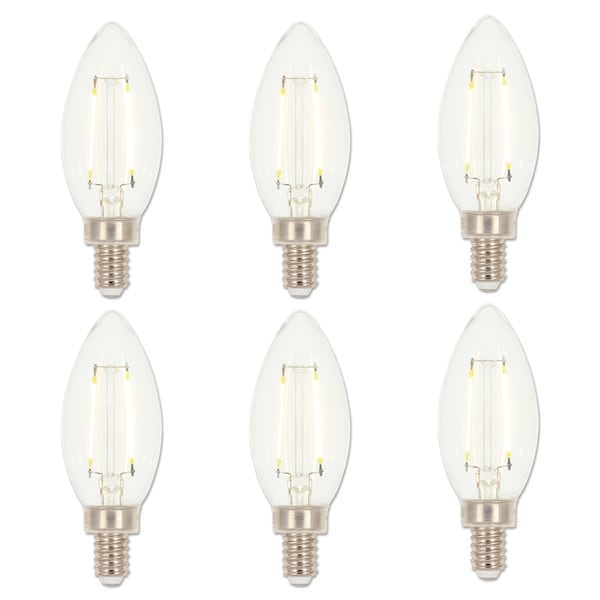 The Westinghouse 6-pack of 3.3W B11 Filament LED Dimmable Light Bulbs is an energy-saving replacement for incandescent torpedo light bulbs. These clear finish LED bulbs illuminate instantly and are ideal for use in chandeliers and sconces, producing 2700K warm white light. Rated for wet locations and can be used in enclosed fixtures such as outdoor-rated wall and post-top lanterns. Long-lasting LEDs are mercury-free, reducing their environmental impact.