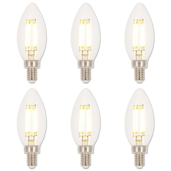 The Westinghouse 6-pack of 4.5W B11 Filament LED Dimmable Light Bulbs is an energy-saving replacement for incandescent torpedo light bulbs. These clear finish LED bulbs illuminate instantly and are ideal for use in chandeliers and sconces, producing 2700K warm white light. Rated for wet locations and can be used in enclosed fixtures such as outdoor-rated wall and post-top lanterns. Long-lasting LEDs are mercury-free, reducing their environmental impact.
